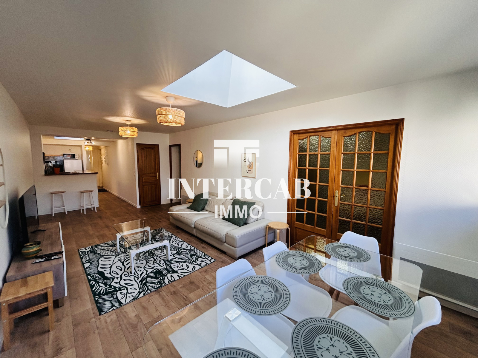 Un vaste séjour regroupant un salon, un espace salle à manger et une cuisine ouverte entièrement équipée (four, plaques de cuisson, lave-vaisselle, réfrigérateur, micro-ondes...)